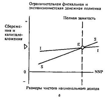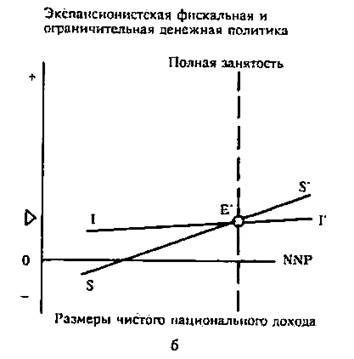 При ограничительной фискальной и экспансионистской денежной политике, то есть в первом случае размеры сбережений и капиталовложений, соответствующие полной занятости, достигают равновесия в точке Е прибыстрых темпах капиталообразования. Во втором случае, когда осуществляется экспансионистская фискальная политика (низкие ставки налогового обложения и дефицита) в сочетании с ограничительной денежной политикой, равновесие, соответствующее полной занятости, достигается в точке Е', при более низком уровне сбережений и капиталовложений (высокий уровень потребления).