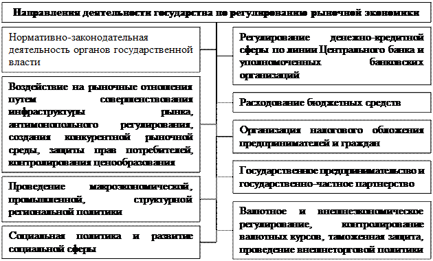 Практическое воздействие современного государства на происходящие в рыночной экономике процессы осуществляется по важнейшим направлениям: нормативно-законодательная деятельность органов государственной власти; регулирование денежно-кредитной сферы; воздействие на рыночные отношения; налоговое обложение предпринимателей и граждан; расходование бюджетных средств; государственное предпринимательство и государственно-частное партнерство; проведение макроэкономической, промышленной, структурной и региональной политики; внешнеэкономическое регулирование; социальная политика и развитие социальной сферы.