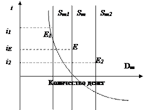 Спрос на деньги должен покрываться их предложением. Оптимальным для денежного рынка является равновесие между спросом и предложением. Графически оно достигается при пересечении кривых Dm и Sm в точке Е. Эта точка определяет равновесную ставку процента iE , т.е. цену денег. Равновесие денежного рынка может нарушаться вследствие изменения, как предложения денег, так и спроса на деньги. Процентная ставка, реагируя на эти изменения, восстанавливает равновесие денежного рынка.