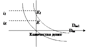 Уменьшение спроса на деньги приведёт к сдвигу кривой Dm 1 в положениеDm . В этом случае при ставке процента i1 предложение денег будет превышать спрос. Банки, население попытаются избавиться от «лишних» денег, покупая ценные бумаги. Эти действия вызовут рост цен на облигации и снижение процентной ставки, но не смогут изменить количество денег, находящихся в обращении. Равновесие будет достигнуто в точке Е, когда ставка процента станет, равна iЕ .