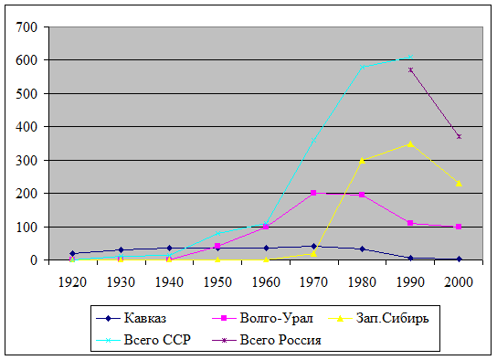 В истории российской нефтедобычи (в большей части — советской) довольно четко наблюдается последовательная смена доминирующих провинций: Кавказ — Волга-Урал — Западная Сибирь. Естественно, были и другие провинции (Западная Украина, Коми АССР, Ферганская впадина, надсолевой Прикаспий, Мангышлак и др.), но они не играли определяющей роли в структуре нефтедобычи (рис. 1).