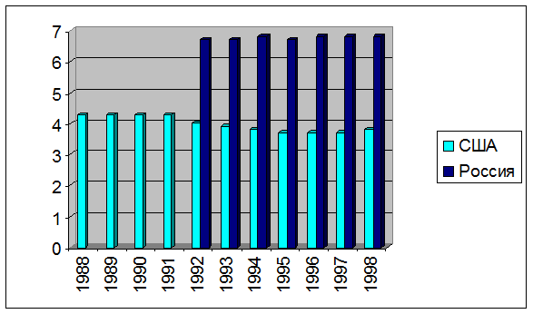 Для сравнения на рис. 2 показана динамика годовой добычи и запасов нефти в России и США в период 1988-98 гг. Приведенная на нем диаграмма иллюстрирует не столько степень падения добычных возможностей нефтяного комплекса России, сколько их потенциал, поскольку главной причиной падения добычи следует считать спросовые ограничения, оставившие невостребованными имеющиеся возможности.