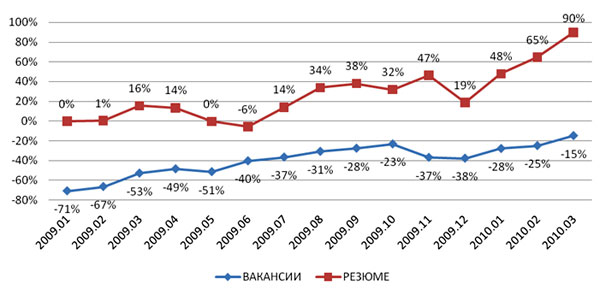В начале 2010 года наблюдался традиционный всплеск активности на рынке, усиленный «отложенным спросом». Количество создаваемых резюме выросло к марту (с декабря 2009 года) на 70%. Хотя в 2009 году рост составил только 16%. Количество вакансий увеличилось на 23% (в 2009 году рост составил 18%)
