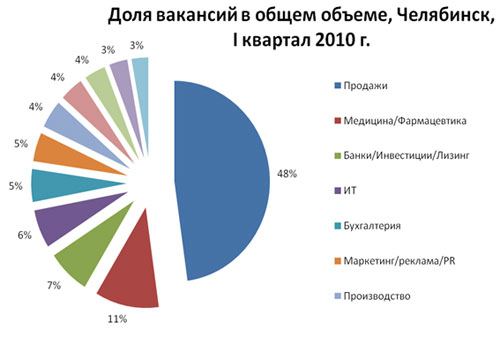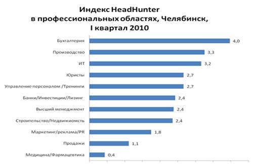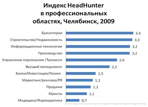 В общем, в Челябинской области наблюдается традиционное оживление рынка труда в начале 2010 года. Но в 2010 году рост числа вакансий и резюме более активный, чем в 2009 году. Это связано с общим оживлением рынка и подъемом экономики. Хотя активный рост резюме по всем профотраслям сопровождается гораздо менее активным ростом вакансий. Наиболее динамично развивались профотрасли «Медицина» и «Маркетинг» (рост вакансий по ним за I квартал 2010 год составил 80% и 50% соответственно). Несмотря на активный рост числа вакансий, до дефицита персонала далеко. Индекс HeadHunter (в профотрасли «Бухгалтерия») также вырос и составляет сейчас 4 (против 3,4 в конце 2009 года).