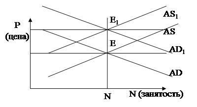 Если количество денег в обращении увеличивается, то это вызывает снижение ссудного процента, повышается платежеспособность спроса, что в итоге приводит к росту цены труда. Цена на рабочую силу гибко реагирует на конъюнктуру рынка. Посредством повышения или понижения цены (заработной платы) регулируется спрос на труд и его предложение. В связи с тем, что уровень полной занятости сохраняется, произойдет смещение кривых спроса и предложения до нового равновесия в точке E1 при более высокой номинальной ставке заработной платы P1.