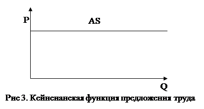 Кейнсианская теория рассматривает рынок труда с достаточно жесткой фиксацией. Уровень занятости, безработицы, заработной платы устанавливается не на рынке труда, а определяется размером эффективного спроса на потребительском и инвестиционном рынках. Т.е., равновесный уровень занятости определяется не конкуренцией на рынке труда, а уровнем дохода, который в свою очередь зависит от совокупного спроса на товары и услуги. Предложение труда не играет ведущей роли в формировании фактической занятости, а характеризует только ее максимально возможный уровень при установившемся размере заработной платы. Функция предложения выглядит как горизонтальная линия.