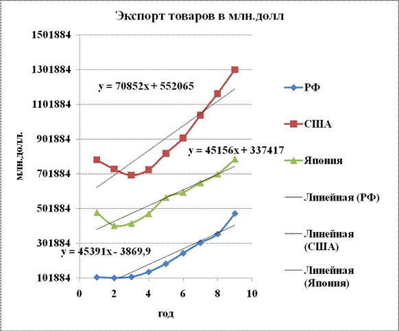 В Таблице №1 приведены данные по экспорту товаров Японии, США и России. Мы видим значительное отстование России посравнению с другими странами. С помощью линии тренда (Рисунок 1) я составила приблизительный прогноз на период 2009-2012гг., основываясь на данные 2000-2008гг. В 2012г. США привысет свой показатель приблизительно в 1,8 раза посравнению с 2000г., Япония в 1,9 раза и только Россия увеличит свой экспорт в 5 раз, но она попрежнему будет оставать от Японии и США.
