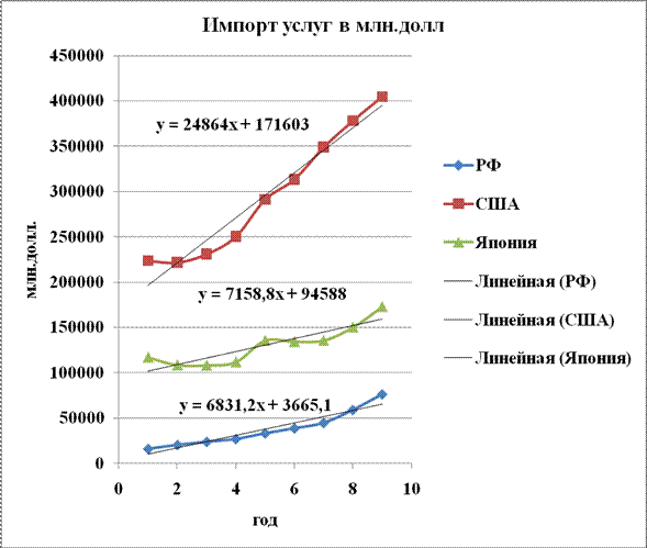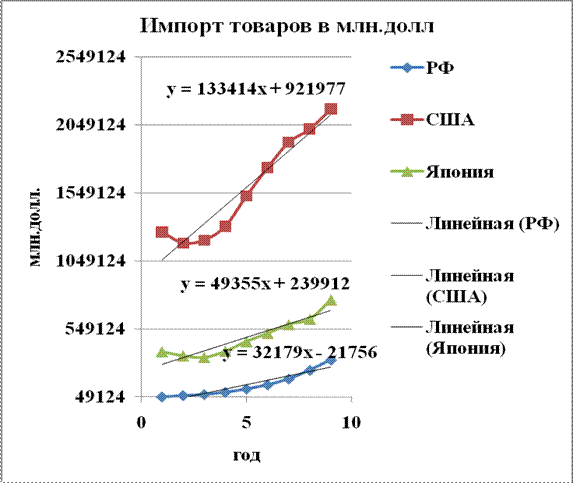 По Таблице №2 и Рисунку 2 можно предположить, что в 2012г. посравнению с 2000г. импорт товаров в США увеличится в 2,1 раза, в Японии в 2,2, а в России в 8 раз.