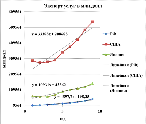Основываясь на Таблицу №3 и Рисунок 3, в 2012г. экспорт услуг США превысет тот же самый показатель 2000г. в в 2,2 раза, Японии в 2,7, а России в 6,6 раз.