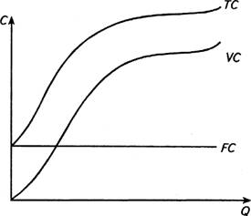 В то же время затраты материалов, топлива, энергии, на заработную плату персоналу и др. изменяются вместе с выпуском. Если выпуск прекращается, то такие издержки сокращаются почти до нуля. С ростом производства переменные издержки возрастают, в то время как общая величина постоянных издержек остается неизменной. Издержки производства, величина которых зависит от объема выпускаемой продукции, называются переменными ( VQ) издержками фирмы. Общие (ТС), или валовые, издержки фирмы равны сумме постоянных и переменных издержек: ТС = FC + VC. На рис. 2.3 представлены линия постоянных издержек, кривые переменных и общих издержек типичной фирмы. Такую форму имеют кривые издержек большинства фирм.