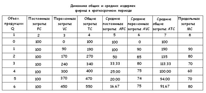 Общие затраты для каждого объема выпуска (колонка 4) получаем, суммируя постоянные и переменные затраты фирмы (колонка 2 плюс колонка 3). Средние постоянные затраты определяем делением постоянных затрат (колонка 2) на выпуск (колонка 1). Средние переменные затраты определяем делением переменных затрат (колонка 3) на выпуск (колонка 1). Средние общие затраты определяются делением общих затрат (колонка 4) на выпуск (колонка 1). Предельные издержки, например 2-й единицы продукта, равны разности общих издержек производства двух изделий (колонка 4) и общих издержек производства одного изделия (колонка 4), и так для каждой последующей единицы изделия.