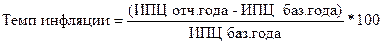 2. Определение силы инфляционных процессов - измерить темпы инфляции за год, но можно рассматривать и более короткие периоды (месяцы или кварталы) или более длинные (десятилетия). Для вычисления темпов инфляции за год нужно вычесть индекс цен прошедшего года из индекса цен этого года, разделить эту разницу на индекс прошедшего года, а затем умножить на 100%. Если темп инфляции получиться отрицательным, значит наблюдалась дефляция (падение цен).