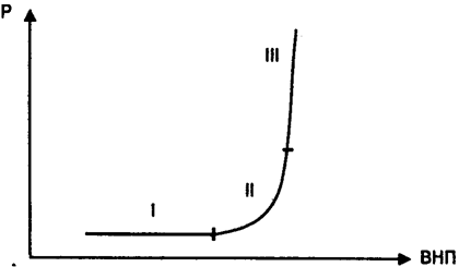 На первом отрезке (I) общие расходы, то есть сумма потребления, инвестиций, правительственных расходов и чистого экспорта, до такой степени низки, что объем национального продукта сильно отстает от своего максимального уровня при полной занятости. Другими словами, существует значительное отставание реального объема ВНП. Уровень безработицы высок, а большая доля производственных мощностей предприятий бездействует. Теперь предположим, что совокупный спрос повысится. Тогда объем производства увеличится, уровень безработицы снизится, а уровень цен возрастет незначительно или вовсе не изменится. Это объясняется тем, что существует огромное количество бездействующих трудовых и материальных ресурсов, которые можно ввести в действие при существующих на них ценах. Безработный не просит увеличить зарплату, когда нанимается на работу. Анализируя спрос и предложение, мы установили, что повышение цен не влияет на увеличение спроса, потому что предложение представляет собой горизонтальную линию. Увеличение трудовых и других ресурсов возможно потому, что имеются бездействующие ресурсы, и дополнительное производство приносит выгоду. В результате существенно увеличивается объем продукции, а цены не повышаются.