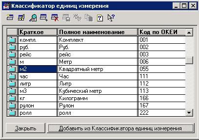 Позиции номенклатуры характеризуются базовой единицей измерения. Эта единица, в которой ведется учтет остатков номенклатуры. Задать их можно в справочнике «Классификатор Единиц Измерения». Вызвать его можно из пункта меню «Справочники» -> «Классификаторы» -> «Единицы Измерения».