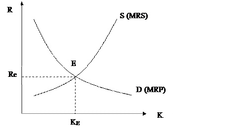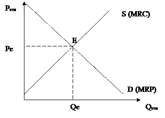 Если рынок готовой продукции также совершенно конкурентный, то кривая спроса на ресурс Dпоказывает предельную доходность ресурса МRР, которую потребители ресурса получат от его дополнительного использования. МRР, как отмечалось ранее, будет снижаться по мере увеличения количества единиц ресурса. Кривая предложения ресурса отражает издержки фирмы, точнее, предельные расходы от использования дополнительной единицы ресурса MRC. Следовательно, в точке Е предельная доходность ресурса MRP равна его предельным издержкам.