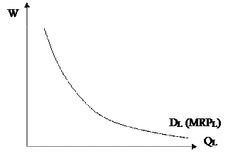 Спрос на труд определяется потребностями работодателей в найме определенного количества работников необходимой квалификации для производства товаров и услуг с учетом совокупного спроса. Руководитель фирмы, желающий нанять работника, предъявляет спрос на труд до того момента, пока выручка от использования предельного (последнего) работника не сравняется с издержками по его использованию, или, другими словами, пока заработная плата предельного рабочего не будет равна выручке, получаемой от его использования фирмой. В экономическом смысле кривая спроса на труд со стороны фирмы есть кривая предельной производительности труда МRРL по его цене W.