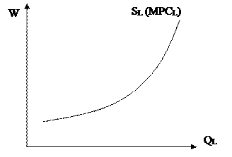 Рыночное предложение труда для определенного вида труда при данной заработной плате есть сумма объемов предложения всех работников. Предложение труда также определяется потребностями людей трудоспособного возраста в нормальном воспроизводстве своих способностей и поддержании достаточного уровня благосостояния, а поэтому оно, так же как и спрос, зависит от величины заработной платы. Но зависимость здесь другая. Кривая предложения труда SL имеет положительный угол наклона: с ростом общего уровня заработной платы предложение труда увеличивается. В экономическом смысле кривая предложения труда SL - кривая предельных издержек труда МRСL . Кривая предложения труда представлена на рисунке 6.