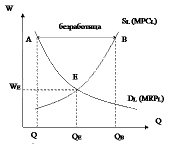 Если заработная плата превышает равновесный уровень заработной платы We , то возникает иная рыночная ситуация. Фирма выбирает такой режим функционирования, который соответствует точке В на кривой предложения. Количество предлагаемого труда превышает спрос на труд Q на величину АВ, т.е. появляется безработица. Поскольку превышение заработной платой ее равновесного уровня не может продолжаться долго (спрос на труд со стороны работодателя уменьшается), то происходит снижение заработной платы до равновесной и ниже в результате избыточного предложения труда. Затем начинается противоположный процесс, возвращающий заработную плату на уровень равновесной и выше. Колебательный характер достижения равновесия на рынке труда свидетельствует о том, что обе ситуации (безработица и наличие незанятых рабочих мест) не могут быть устойчивыми, они подвергаются коррекции со стороны рыночных механизмов в направлении восстановления положения полной занятости.