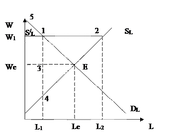 2. Существенное изменение кривой предложения труда. Поскольку ставка заработной платы не изменяется от числа занятых, кривая предложения преобразуется в горизонтальную линию на уровне W1 , (S/ L ). В точке 2 она сольется с кривой SL поскольку правее точки 2 все точки кривой SL соответствуют более высокому (по сравнению с W1 ) уровню заработной платы.