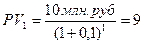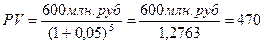 Сначала определим, сколько стоит сегодня возможность получить 600 млн. руб. через 5 лет при банковской ставке 5% годовых. Иначе говоря, какую сумму следовало бы положить сегодня в банк, чтобы иметь на счете через 5 лет 600 млн. руб.? Эта сумма рассчитывается по формуле текущей стоимости