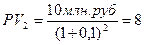 В нашем случае дисконтированная стоимость будущего дохода в 600 млн. руб. составляет 470 млн. 109 тыс. руб. Сегодняшние капиталовложения I равны 500 млн. руб. Таким образом, чистая приведенная стоимость составит: