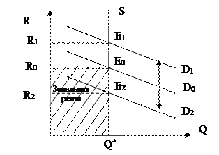 На оси абсцисс откладывается количество земли, а на вертикальной - рента. Пересечение кривой спроса D0 , с кривой предложения S определяет равновесие на рынке земли; R0 означает уровень ежемесячной ренты за единицу площади земли. Площадь 0Q*E0 R0 представляет собой совокупную ренту за всю используемую в данном обществе землю. Изменение спроса на основной продукт питания (пшеницу) повысит ежемесячную ренту за единицу площади земли с R0 до R1 . Это приведет и к увеличению чистой экономической (абсолютной) ренты до площади 0Q*E1 R1 . В случае падения спроса на пшеницу ежемесячная земельная рента уменьшится до R2 и абсолютная рента сократится до 0Q*E2 R2 .