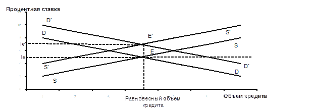 Рассмотрим, как изменения в спросе и предложении повлияют на рыночные процентные ставки. Предположим, что заемщики ожидают увеличение темпа инфляции и снижения реальных издержек заимствования. При данной ставке iе процента спрос на кредит способен превзойти предложение. Кривая спроса на кредит сдвигается вправо, из положения DD в положение D`D` (рисунок 1). Превышение спроса будет оказывать давление в сторону повышения процентной ставки. С другой же стороны предположения кредиторов об увеличении темпов инфляции, т.е. снижению в будущем доходности их активов приведут к снижению предложения кредита при данной ставке процента, что усилит избыточный спрос. Кривая предложения сдвигается влево, в положение S`S`. Часть заемщиков лишается возможности получить кредит, другая часть вынуждена брать кредит по более высокой в сравнении с действующей ставкой процента. В результате на рынке установится новый более высокий уровень процентных ставок i е . При этом равновесный объем кредита в экономике может не измениться по сравнению с предыдущим состоянием рынка.