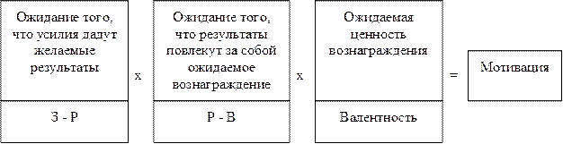 Третий фактор, определяющий мотивацию в теории ожидания — это валентность или ценность поощрения или вознаграждения. Валентность — это предполагаемая степень относительного удовлетворения или неудовлетворения, возникающая вследствие получения определенного вознаграждения. Поскольку у различных людей потребности и пожелания в отношении вознаграждения различаются, то конкретное вознаграждение, предлагаемое в ответ на достигнутые результаты, может и не иметь для них никакой ценности. Если значение любого из этих трех критически важных для определения мотивации факторов будет мало, то будет слабой мотивация и низки результаты труда. Соотношение этих факторов можно выразить следующей формулой (она показана и на рис. 2).