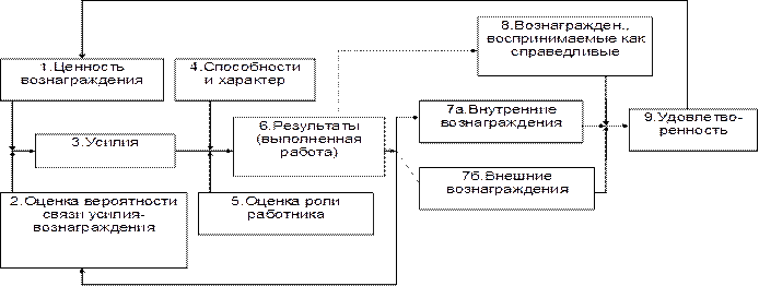 Согласно модели Портера-Лоулера результаты, достигнутые сотрудником, зависят от трех переменных: затраченных усилий (3), способностей и характерных особенностей человека (4), а также от осознания им своей роли в процессе труда (5). Уровень затрачиваемых усилий в свою очередь зависит от ценности вознаграждения (1) и того, насколько человек верит в существование прочной связи между затратами усилий и возможным вознаграждением (2). Достижение требуемого уровня результативности (6) может повлечь внутренние вознаграждения (7а), такие, как чувство удовлетворения от выполненной работы, чувство компетентности и самоуважения, а также внешние вознаграждения (7б), такие, как похвала руководителя, премия, продвижение по службе.