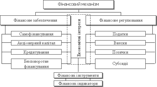 Розглянемо складові фінансового механізму підприємства. Фінансове забезпечення полягає у виділенні певної суми фінансових ресурсів на розв’язання окремих завдань фінансової політики господарюючого суб’єкта. При цьому розрізняють забезпечувальну і регулятивну його дію. Забезпечувальна дія проявляється у встановленні джерел фінансування, тобто покриття повсякденних потреб і характеризує пасивний вплив фінансового забезпечення. Регулятивна дія здійснює вплив через виділення достатніх коштів та через конкретну форму фінансового забезпечення і характеризує активний вплив фінансового забезпечення. В цілому ж дія фінансового механізму спрямована на реалізацію економічних інтересів учасників фінансових відносин (рис. 1).