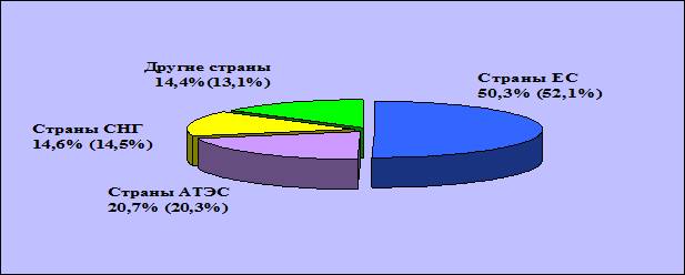 Страны дальнего зарубежья являются главными партнерами России. В 2009 году их доля в товарообороте составила 85,4%, в том числе в экспорте – 84,5%, в импорте – 87,0 процента. Стоимостные объемы российского экспорта и импорта с этими странами в 2009 году по сравнению с 2008 годом снизились на 35,9% и 36,8% соответственно. Сальдо торгового баланса осталось положительным - 109,3 млрд. долларов США, но уменьшилось на 34,7 процента.