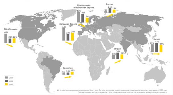 Инвесторы продолжают считать Западную Европу привлекательным регионом для инвестиций (38%), лишь незначительно уступающим Китаю (39%). Однако они обеспокоены положением в странах Центральной и Восточной Европы, которые в 2009 году занимали второе место. В этом году рейтинг инвестиционной привлекательности данного региона снизился с 42% до 24%.