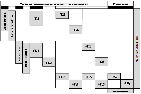 Ниже приведена схема матрицы технологических способов (рис. 2) модификации модели, предназначенной для оценки эффективности предпринимательской деятельности при неоднозначности исходной информации, касающейся возможностей привлечения круглого леса для переработки в Новосибирской области из многолесного района и возможных изменений цен реализации продукции на «внешнем» рынке.