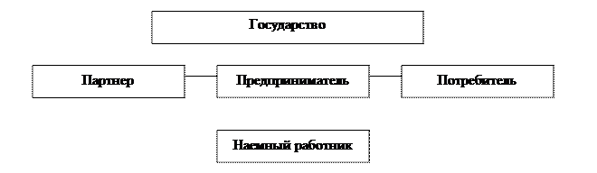 Основным субъектом предпринимательской активности выступает предприниматель. Однако предприниматель — не единственный субъект, в любом случае он вынужден взаимодействовать с потребителем как основным его контрагентом, а также с государством, которое в различных ситуациях может выступать в качестве помощника или противника. И потребитель и государство также относятся к категории субъектов предпринимательской активности, как и наемный работник (если, конечно, предприниматель работает не в одиночку), и партнеры по бизнесу (если производство не носит изолированного от общественных связей характера) (рис. 1).
