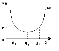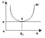 Нижче показано три можливі варіанти положення фірми на ринку. Якщо лінія ціни Р лише торкається кривої середніх витрат АС в мінімальній точці М , то фірма в змозі лише покрити свої мінімальні витрати. Точка М в даному випадку є точкою нульового прибутку .