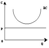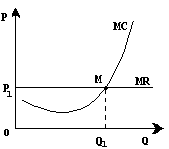 Нижче показано, що із збільшенням виробництва крива граничних витрат (МС ) йде вгору і перетинає горизонтальну лінію граничного доходу, рівного ринковій ціні Р1 , в точці М , відповідній обсягу виробництва Q1 . Будь-яке відхилення від цієї крапки призводить до втрат для фірми або у вигляді прямих збитків при більшому обсязі виробництва, або в результаті скорочення маси прибутку при зменшенні випуску продукції.