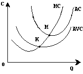 Звернемо увагу, що коли фірма нічого не виробляє, вона несе тільки постійні витрати. Якщо ж вона виробляє продукцію, то до постійних витрат додаються змінні, але при цьому фірма отримує і деякий дохід від продажів. Тому, щоб зрозуміти, коли фірма мінімізує збитки, треба зіставити рівень ціни не тільки з середніми витратами (AC ), але і з середніми змінними витратами (AVC ).