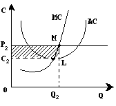 Якщо на якомусь інтервалі лінія ціни і граничного доходу розташовується вище за криву середніх витрат, то в точці рівноваги М фірма отримуватиме квазіренту, тобто прибуток, що перевищує нормальний рівень. При оптимальному обсязі виробництва Q2 середні витрати будуть рівні С2 , отже, валові витрати складуть площу прямокутника OC2 LQ2 . Валова виручка (прямокутник OP2 MQ2 ) буде більша, і площа заштрихованого прямокутника C2 P2 ML покаже нам загальну масу отримуваного надприбутка.