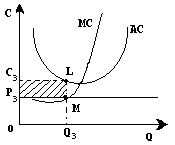 На третьому малюнку показана інша ситуація: середні витрати при будь-якому обсязі виробництва перевищують ринкову ціну. В цьому випадку навіть при оптимальному обсязі виробництва (МС=Р ) фірма зазнає збитків, хоча вони і менше, ніж при інших обсягах виробництва (площа заштрихованого прямокутника P3 C3 LM мінімальна саме при обсязі виробництва Q3 ).