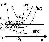 Ринкова ціна Р1 нижча за мінімальні середні витрати, але вища за мінімальні середні змінні витрати. При оптимальному обсязі виробництва Q1 величина середніх витрат виробництва складе відрізок Q1 M , величина середніх змінних витрат – відрізок Q1 L . Отже, відрізок ML – це середні постійні витрати. Якщо фірма продовжує працювати, то її валова виручка (прямокутник OP1 EQ1 ) буде менше повних витрат (прямокутник OCТ MQ1 ), але при цьому будуть покриті змінні витрати (прямокутник OCv LQ1 ) і частина постійних витрат. Розмір збитків вимірюватиметься площею прямокутника P1 C1 ME . Якщо ж фірма зупинить виробництво, то збитки складуть всю величину постійних витрат (прямокутник Cv CТ ML ). Таким чином, поки ціна вища за мінімальні середні витрати, фірмі в короткостроковому періоді вигідніше продовжувати виробляти продукцію, оскільки в цьому випадку мінімізуються збитки. Якщо ціна рівна мінімальним середнім змінним витратам, то для неї байдуже, продовжувати виробництво або зупиняти його. Якщо ж ціна впаде нижче за мінімальні середні змінні витрати, тоді виробництво продукції повинно бути припинене.