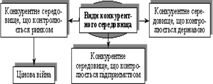 Важливий елемент, що впливає на рівень цін, — конкуренція. Залежно від того, хто контролює ціни, вирізняють три види конкурентного середовища (рис.3).
