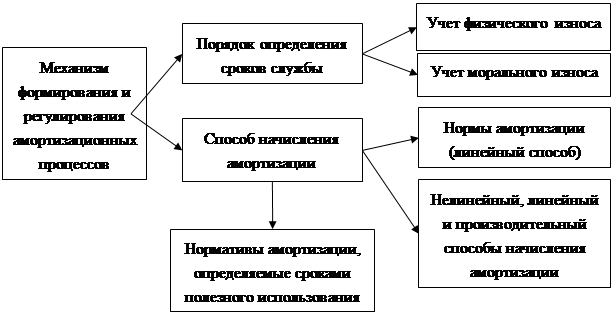 Система регулирования амортизационных процессов формируется механизмом определения сроков службы основных средств и нематериальных активов, опирающимся на учет физического и морального износа, а также механизмом начисления амортизации, который базируется на нормах амортизации и нормативах, определяемых сроками полезного использования, линейных, нелинейных и производительных способах начисления амортизации.