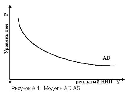 Графически модель совокупного спроса представляется в виде кривой с отрицательным наклоном, которая характеризует обратную зависимость между объемом покупаемого реального ВНП и уровнем цен. На рисунке А 1, приложения А, кривая совокупного спроса AD показывает количество товаров и услуг, которое потребители готовы приобрести при каждом возможном уровне цен. Она дает такие комбинации объема выпуска и общего уровня цен в экономике, при которых товарный и денежный рынки находятся в равновесии.(см.Приложение А, рис.А 1)