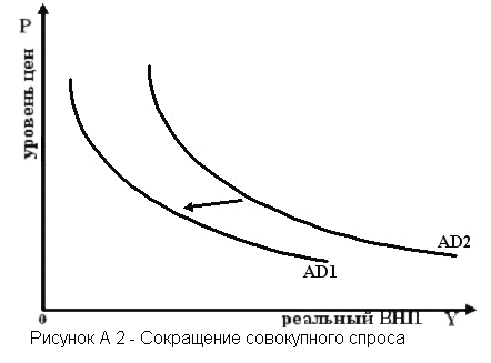 Влияние вышеперечисленных неценовых факторов на совокупный спрос в конечном итоге можно свести к изменениям денежной массы и скорости обращения денег. Изменение неценовых факторов отражается сдвигом кривой AD. Например, снижение спроса на нефть на мировом рынке и соответствующее сокращение экспорта приведет к сокращению совокупного спроса. Это отразится графически сдвигом AD влево (см. Приложение А, рис.А 2). Сдвиг кривой совокупного спроса под влиянием неценовых факторов напрямую связан с размером реального ВНП и как следствие объемов производства, но не сказывается на уровне цен.