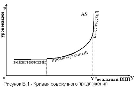 В современном макроанализе выделяют три отрезка кривой совокупного предложения: кейнсианский, промежуточный и классический(см.приложение Б, рис.Б 1).