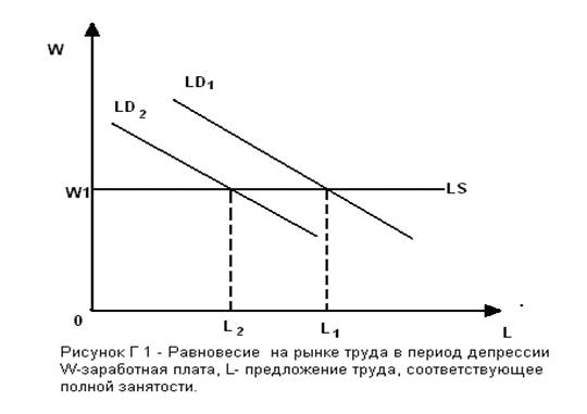 В своем анализе Кейнс исходил прежде всего из факта неизменности уровня зарплаты, закрепленного коллективно-договорной системой и официальным законодательством.(см.приложение Г, рис. Г 1) При таком условии, падение совокупного спроса приведет к падению объема производства и сокращению спроса на труд. Другими словами, уровень зарплаты не снизится, хотя и появятся безработные.