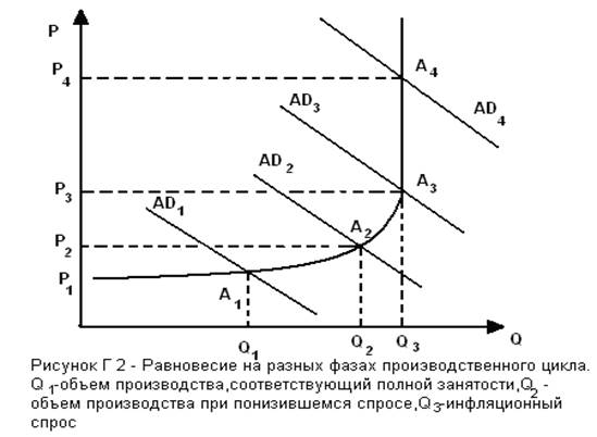 Поскольку заработная плата не меняется и не происходит снижение издержек производства, вряд ли стоит ожидать изменение цен на товары и услуги, равно как и увеличение производства. Экономика приходит в устойчивое равновесие при новом уровне производства, соответствующее неполной занятости(см.приложение Г, рис. Г 2,точка А1 ). Когда все дешевые ресурсы будут исчерпаны, а дальнейшее увеличение объемов производства вслед за увеличивающимся спросом необходимо, расширение производства за счет использования более дорогих ресурсов. Кроме тог цены на ресурсы будут расти вследствие увеличения спроса на них. Рост издержек производства приведет к росту цен, и новая точка равновесия установится на этой фазе развития в точке А2 . Поскольку производство развивается и доходы населения растут, то рост цен не снижает спроса, а стимулирует дальнейшее развитие производства. Наконец, при полном использовании всех имеющихся ресурсов в обществе дальнейшее увеличение объемов производства становится невозможным, и равновесие устанавливается в точке А3 . Доходы в обществе достаточно большие, и при стабильном предложении растущий спрос удовлетворяется по более высоким ценам, то есть на вертикальном отрезке кривой предложения AS точка равновесия будет определяться только уровнем цен и спроса[9].