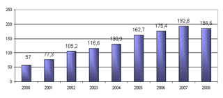 Рис. 3.1. Обсяги виробництва пива в Україні за 2000-2008рр. (млн.дал)