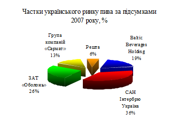 Незважаючи на велику кількість виробників (понад 50 броварень), погоду на вітчизняному пивному ринку роблять чотири компанії: дві транснаціональні («САН Інтербрю» й Baltіc Beverages Holdіng) і дві вітчизняні — «Оболонь» і «Сармат» (продана у 2009 році транснаціональній компаніїї Submіller). У портфелях четвірки понад 30 брендів і сотні найменувань пива. Разом вони контролюють більше 94% ринку, витісняючи не тільки невеликі місцеві компанії, але й великих імпортерів.