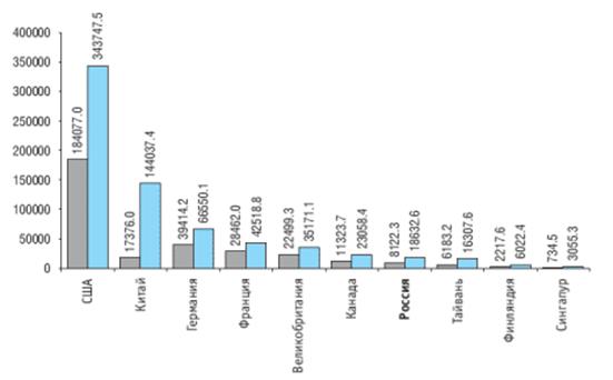Рис.1.1 Динамика внутренних затрат на инновации и разработки в некоторых странах (млн. долл. США; в расчете по паритету покупательной способности национальных валют)